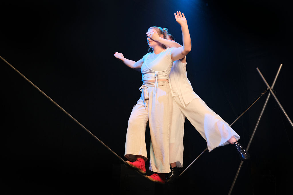 The impulse for the creation came from slack rope dancers Fanni Silmunen and Saila Jantunen. They challenge the customary image of slack rope as a solo discipline in traditional circus. On stage they present duo slack rope techniques never seen before in Finland. Touch plays an essential role in maintaining balance when dancing on the slack rope as duo.