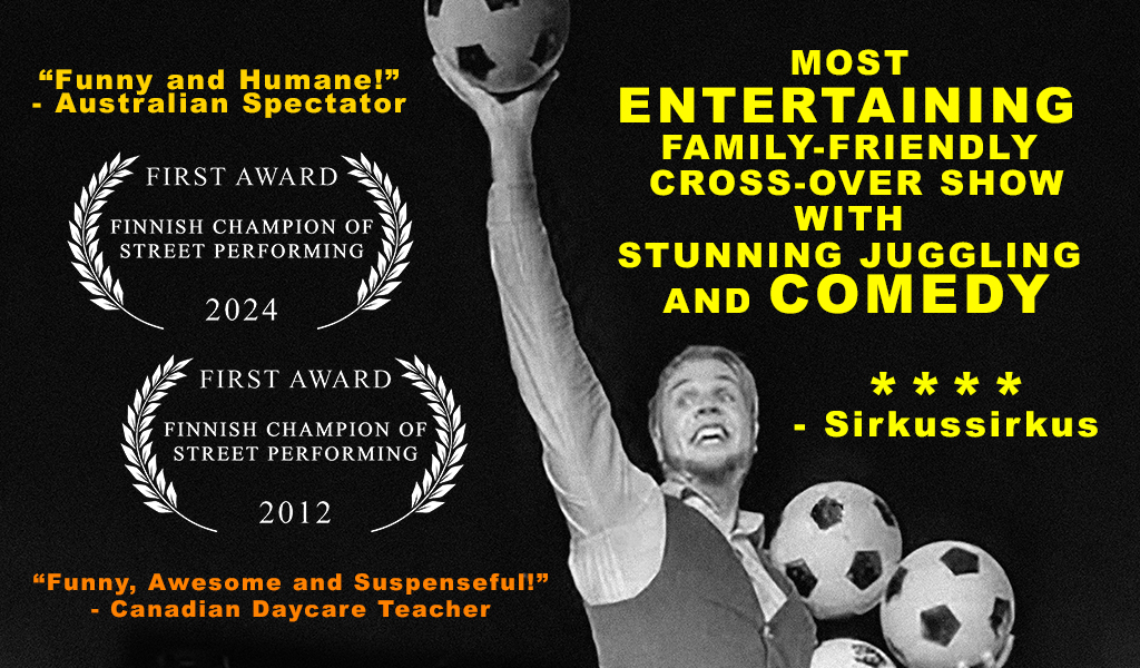 During the past years Kai Kuutamo has been performing in Thailand, Cambodia, England, France, Sweden, Estonia, Belgium, Iceland and of course all around Finland. This show is the culmination of all the experience around the world and it contains the best tricks from along the way. Amazing juggling feats and fun times await! See you in the show!